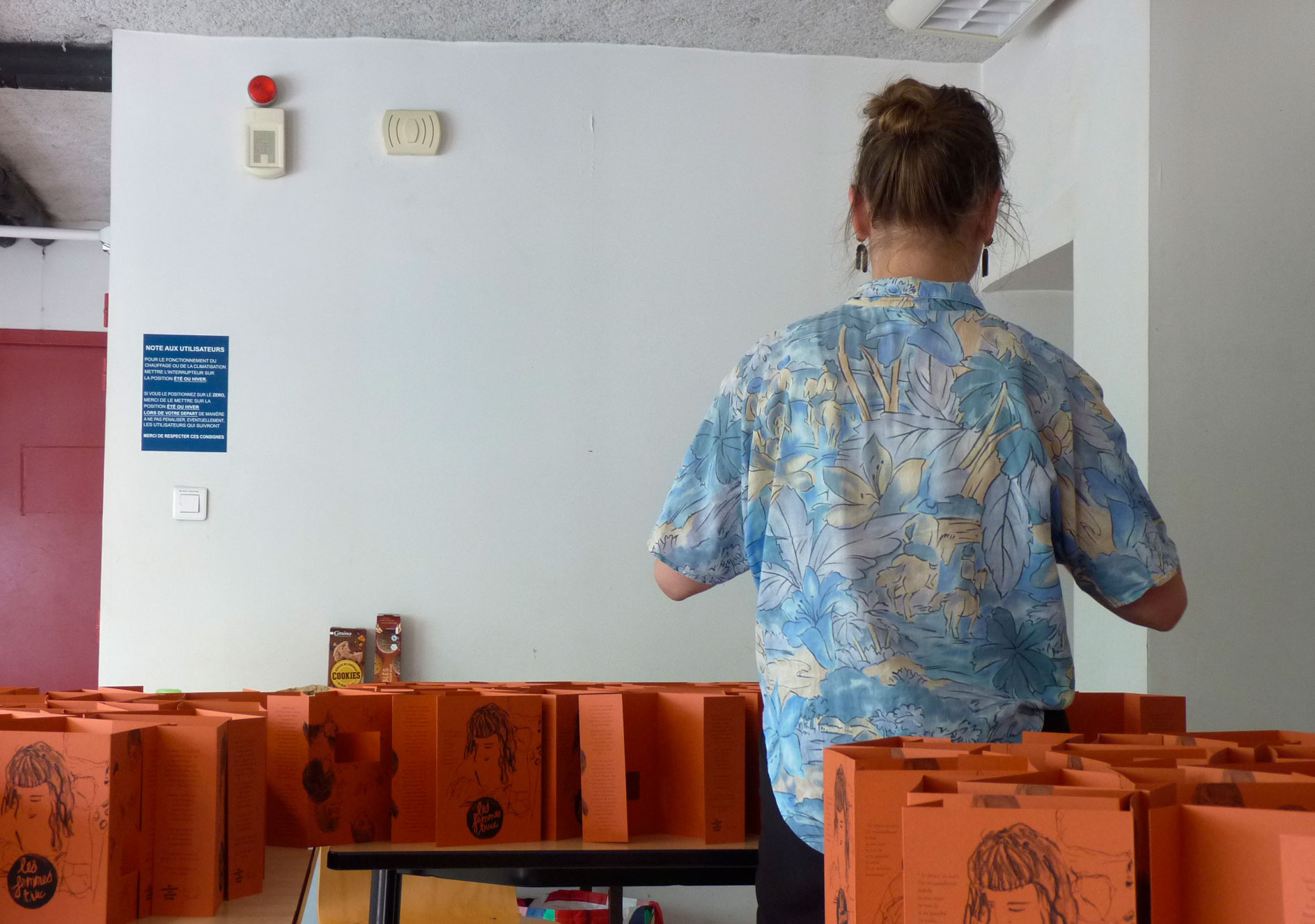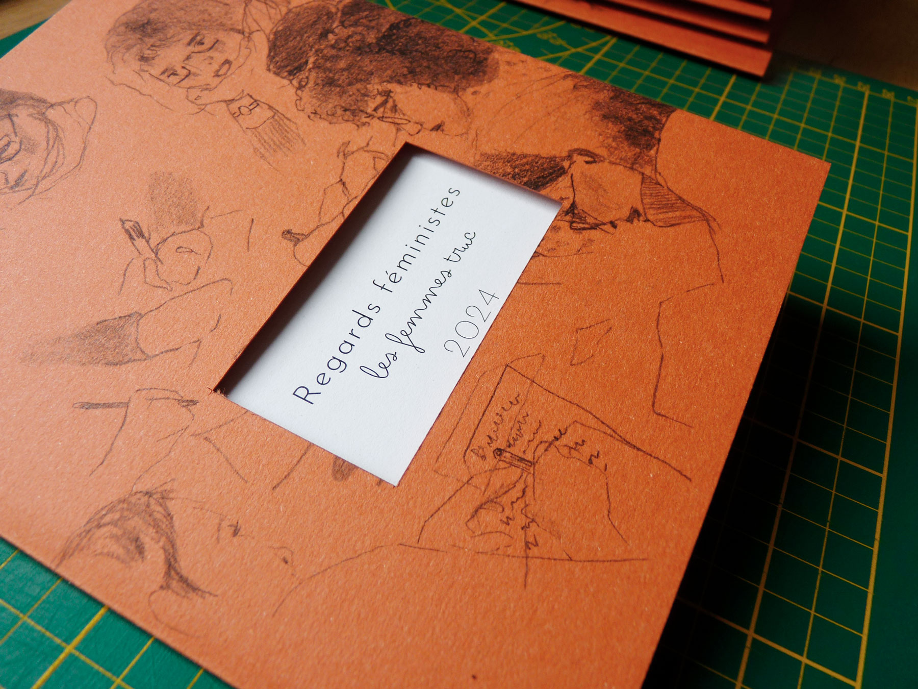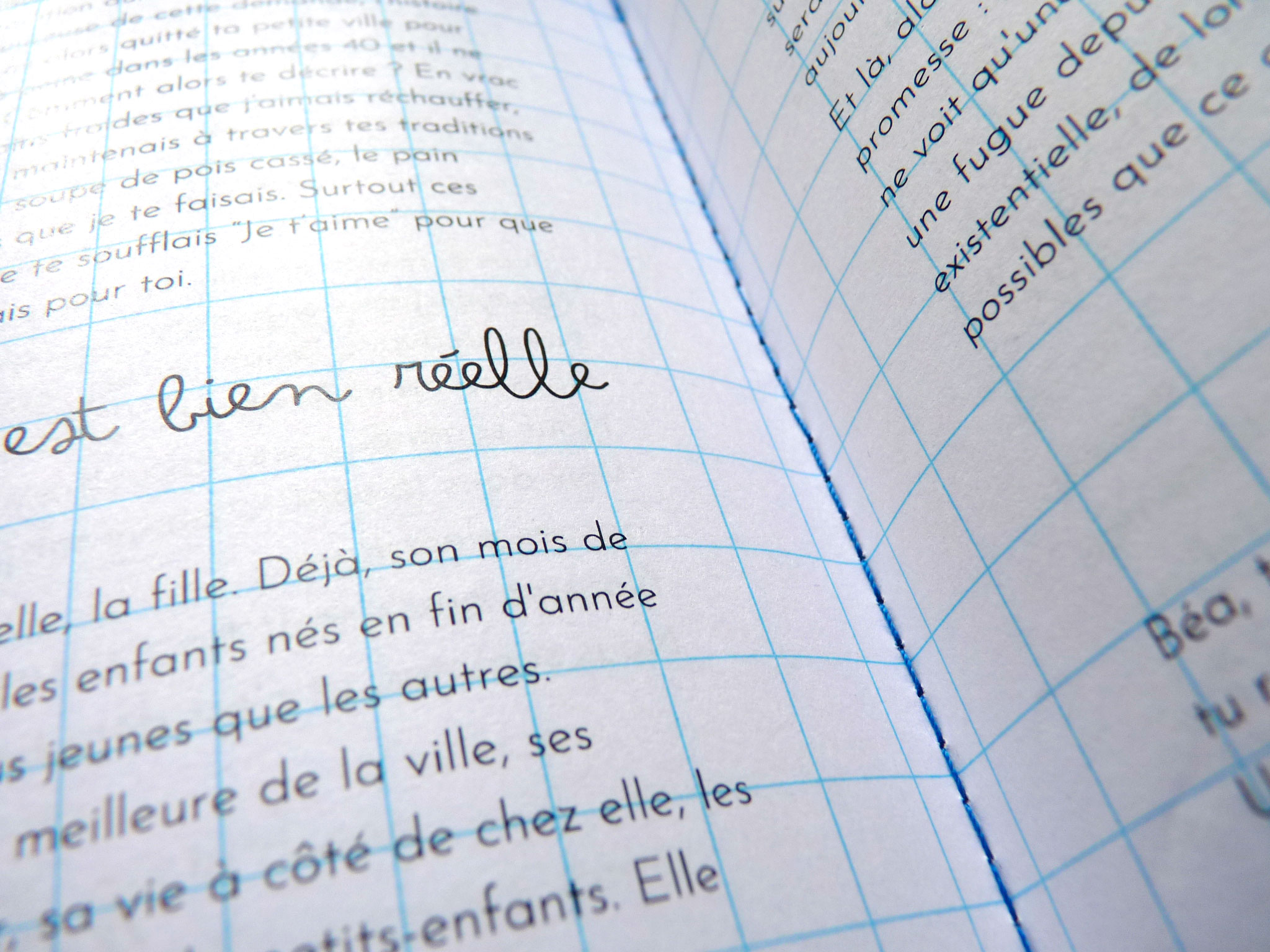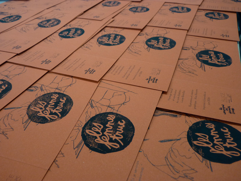 J’ai également travaillé à la création d’un livre illustré réunissant une sélection des textes, auto-éditée en 200 exemplaires… de la conception de la maquette à l’animation d’un atelier collectif de façonnage et reliure des livres avec la participation des Femmes truc. Les coulisses de la fabrication sont à découvrir plus bas. L’édition est disponible auprès de la Cie du Dernier Étage ainsi qu’à la librairie Les Modernes (Grenoble).