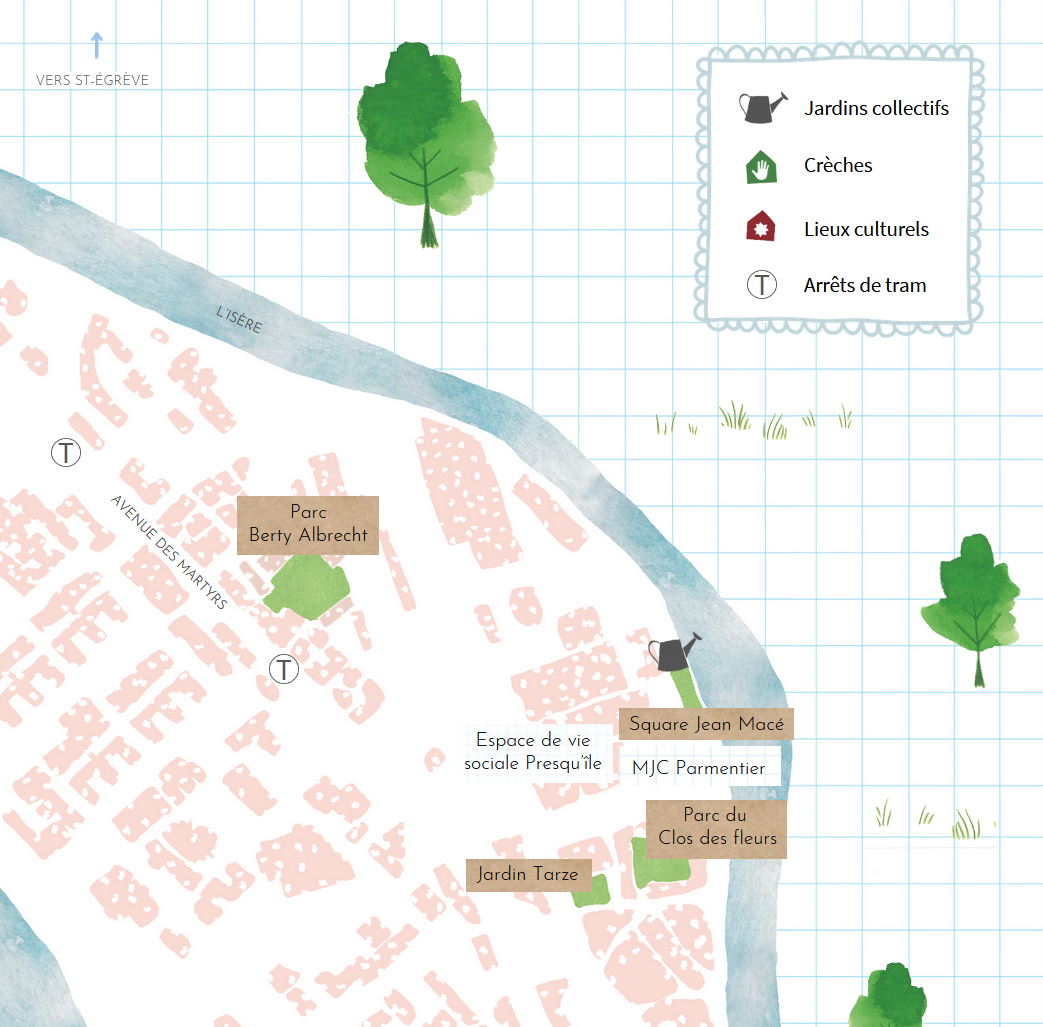 La Maison des Habitant-es (MDH) et les équipements du secteur 1 de Grenoble intervenant auprès des familles du quartier ont exprimé le besoin d’un document identifiant les lieux ressources pour les habitant-es, autour de la parentalité et de la petite enfance. J’ai été sollicitée par la MDH pour concevoir une carte illustrée du quartier permettant de recenser et de localiser ces lieux à l’attention des familles, ainsi que pour créer un corpus d’illustrations représentant les parcs et jardins du quartier.